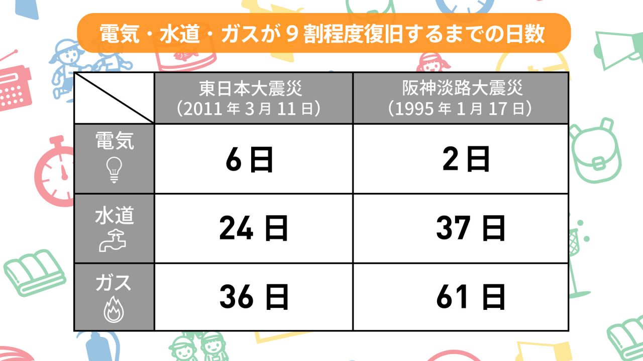 1995年の阪神淡路大震災、2011年の東日本大震災での、各ライフラインの復旧までの日数は下記の図のようになっています。
