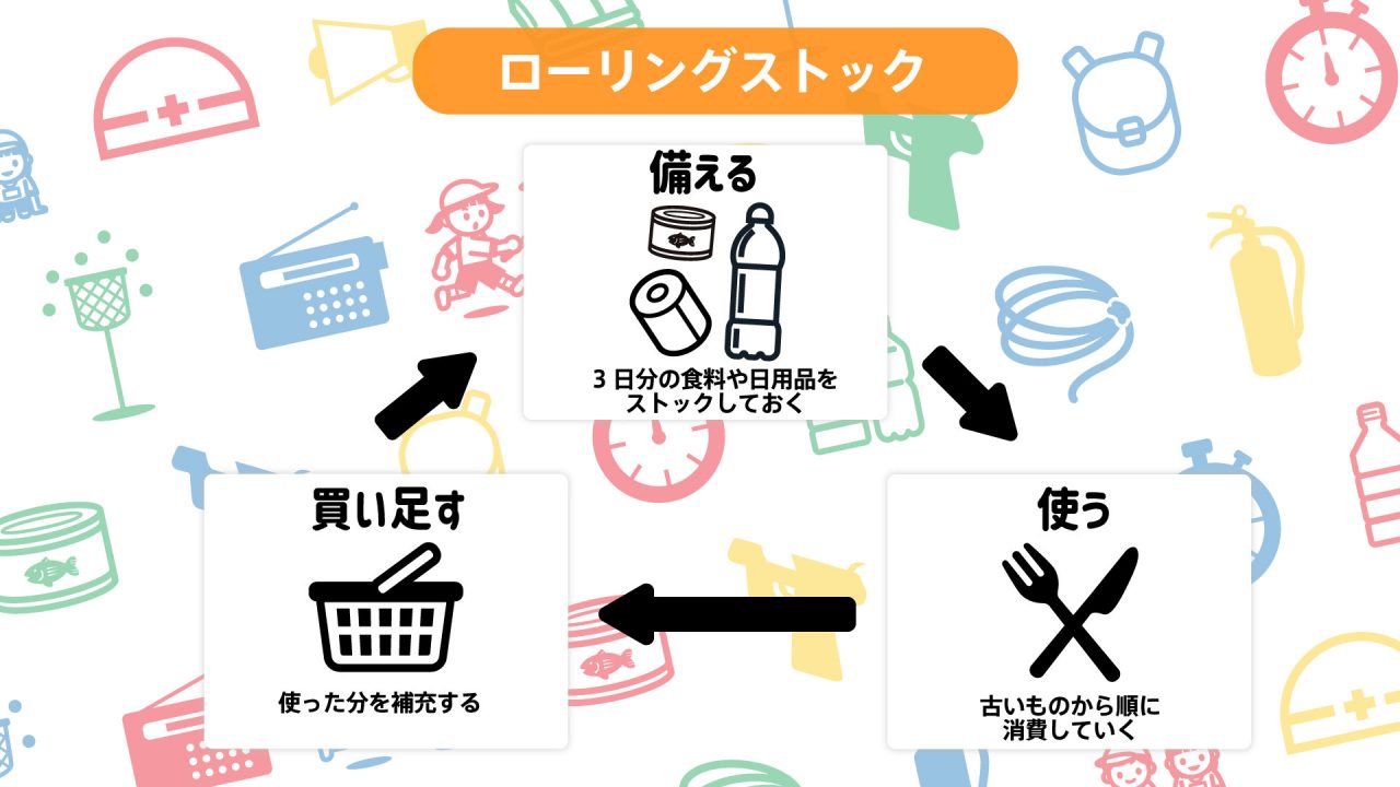 賞味期限が半年以上先のものを購入し、期限が古いものから普段の生活で消費して新しいものを補充する「ローリングストック」を行いましょう。