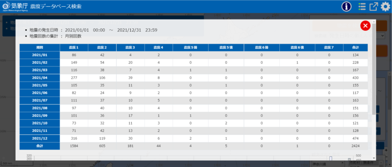 また、気象庁が公開している震度データベース検索によると、2021年における震度1以上の地震発生数は2424回となっており、震度5弱以上の大きな地震が10回も起こっています。