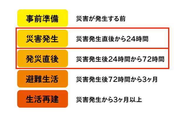 災害発生から72時間以内を指す「発災直後」は、ライフラインが断絶されている中で生活をしていかなければならないことが多く、健康面・心理面における2次災害も想定されます。よく「非常食は最低3日分準備しておくこと」と言われるように、72時間という数字は防災における大きな指標となっています。