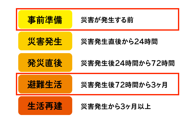 防災のフェーズのうち1つ目が、「事前準備」。このフェーズでは、災害に対する備蓄品を用意することや、避難経路を確認しておくことなどが重要です。