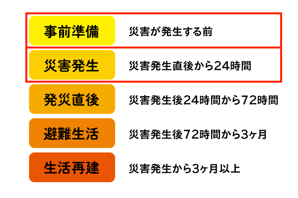 次の「災害発生」フェーズは、災害発生直後から24時間以内を指します。自分や大切な人の命を守るために瞬時に適切な行動を取れるかが大切となります。