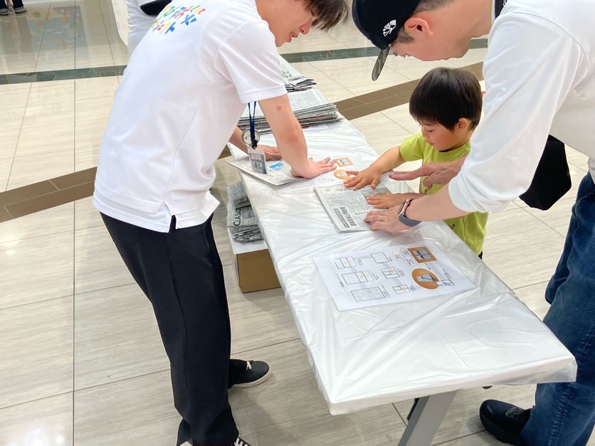 地震が起きて避難しなくてはいけないけれど、足元ががれきだらけで危ない……そんな状況を想定し、参加者の皆様には、足を保護する新聞紙スリッパを作成いただきます。