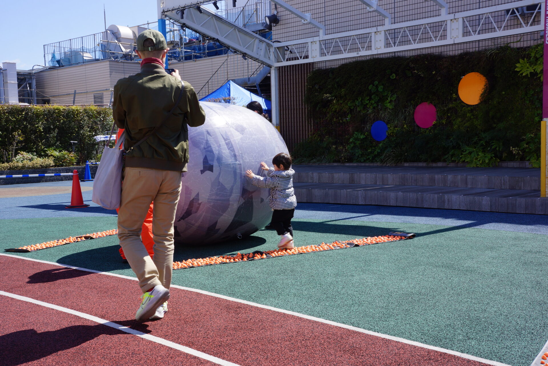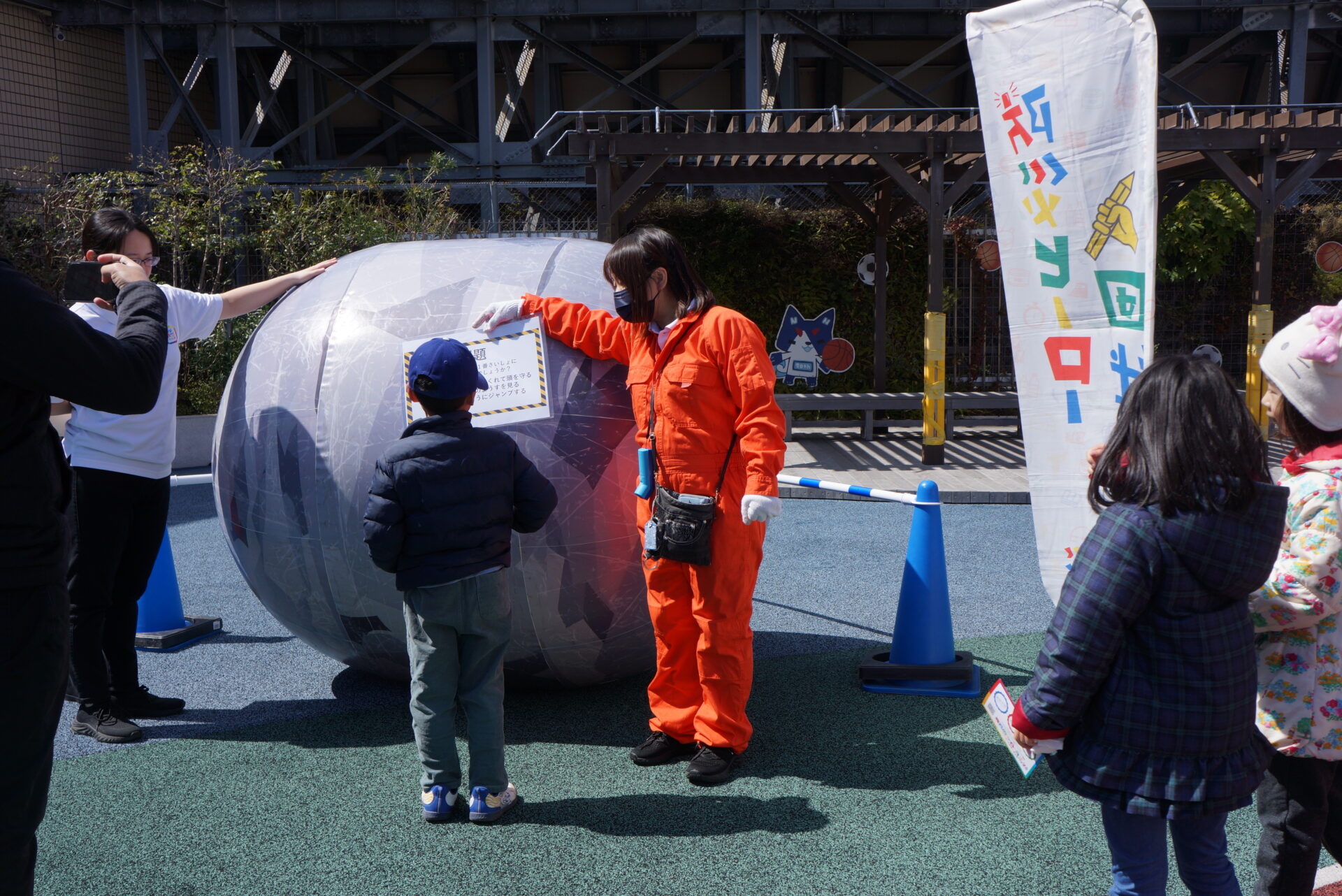 瓦礫に見立てた大玉を転がしながら障害物を突破できたらクリアとなります。