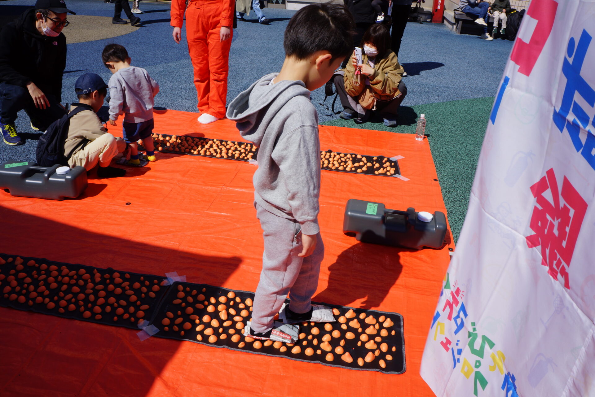 実際の避難現場でも使われた新聞紙スリッパを作り、瓦礫に見立てた足つぼマットの上を歩きます。