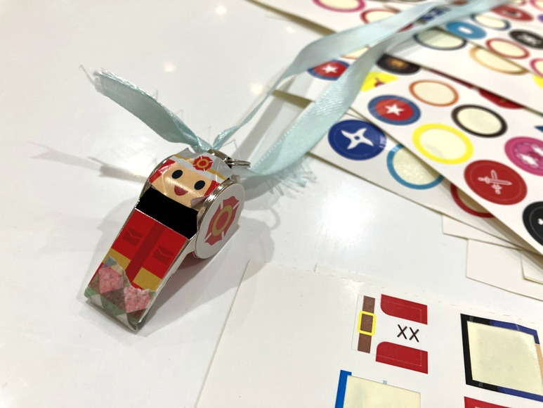 オリジナルホイッスル作りでは、カラフルなシールやリボンを使い、世界にひとつだけの防災ホイッスルを手作りします。子どもたちは真剣な表情で飾り付けを楽しみながら、いざという時に役立つアイテムの存在を学んでいました。