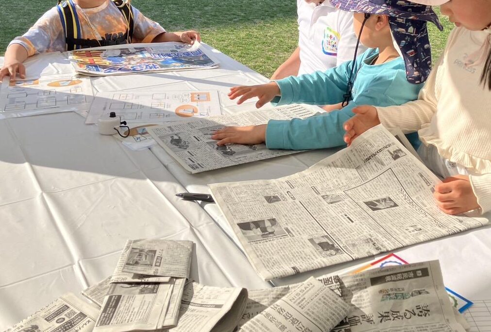 その後、新聞紙を使って防災スリッパを作る工程へ入ります。大地震の際、ガラスや食器の破片が床に散乱し、靴がなければ安全に移動できないこともしばしば。そんな時に、身近にある新聞紙で簡易スリッパを作れる知識があると、安全に避難できます。