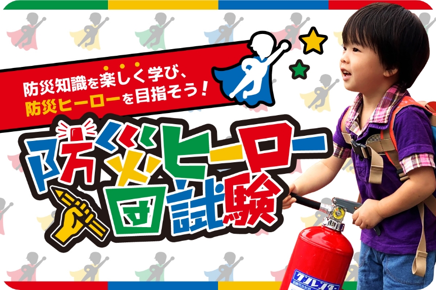 防災ヒーロー⼊団試験は⼦供でも参加可能な体験型防災アクティビティです。体と頭を動かしながら楽しく防災を学び、親⼦で「もしも」を考えます。楽しいだけでなく役に⽴つ⼊団試験で、⽬指せ防災ヒーロー︕