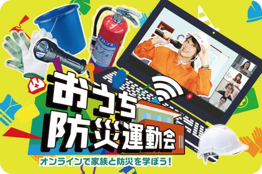 おうち防災運動会はオンラインでみんなで防災を体験できる新しい防災アクティビティです。運動会ならではのチームでの競争を楽しみながら、今考えないといけない防災についておうちにいるからこそ考え、体験できます。