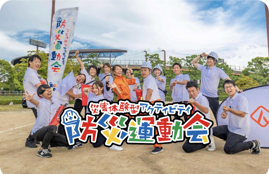 防災運動会は運動会に防災知識を取り⼊れた新しい運動会です。運動会としての楽しさを残しながらも、防災に関する知識や知恵を⾝につけ、⾃分で助かる・他⼈を助けることの⼤切さを学べます。楽しいだけでなく役に⽴つ、それが防災運動会です。