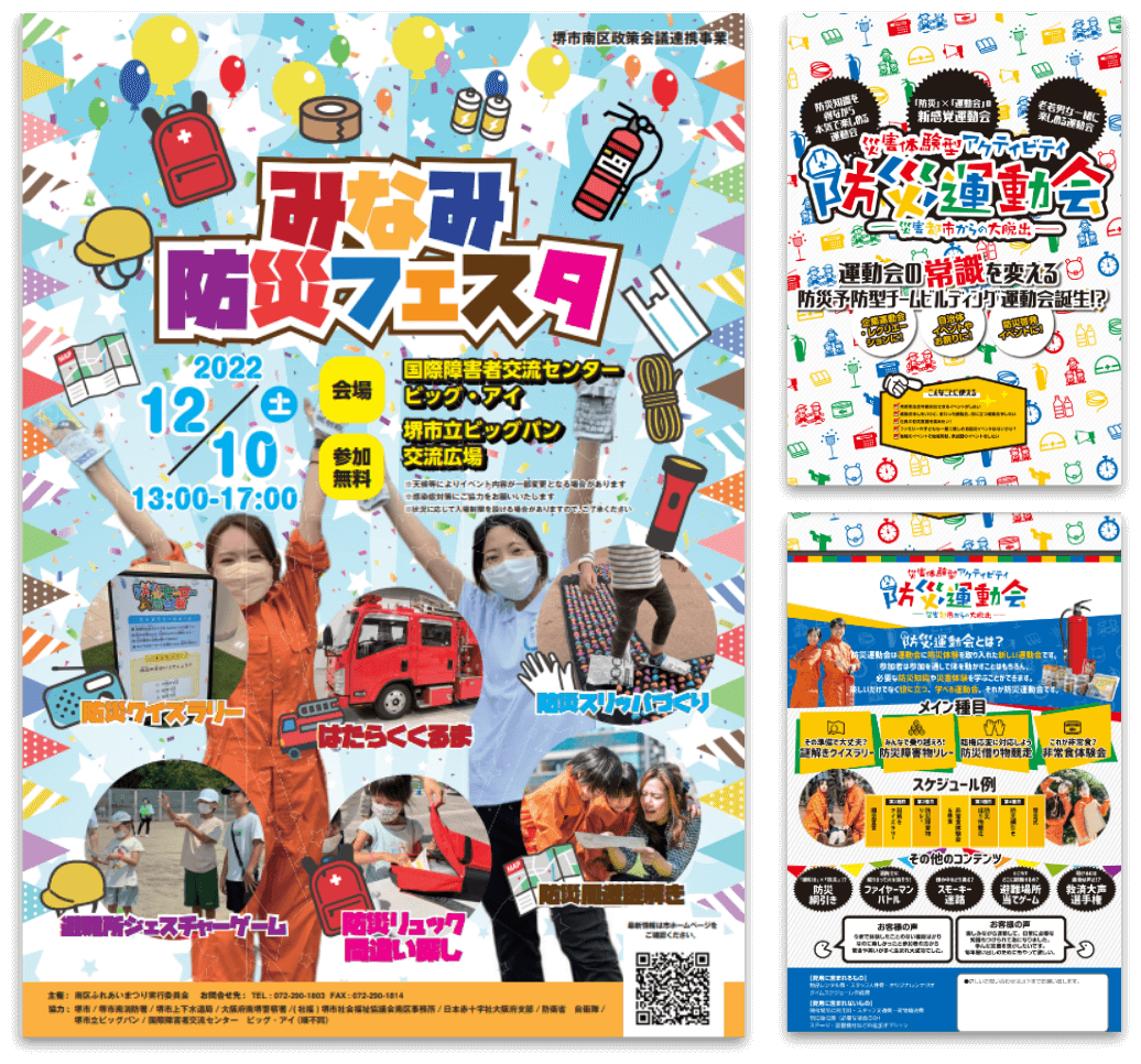みなみ防災フェスタは、堺市・南区にて開催された防災イベントです。IKUSAは、国際障害者交流センタービッグ・アイ屋内会場の体験型エリアにて、防災を楽しく学べるワークショップの運営をさせていただきました。また、ポスターやバナーの制作、ノベルティグッズの制作もサポートさせていただきました。